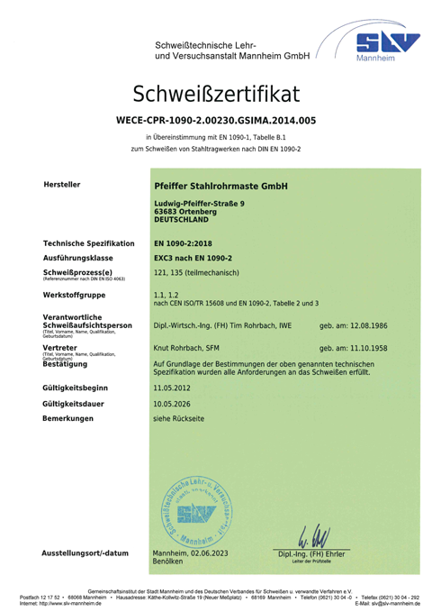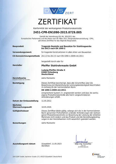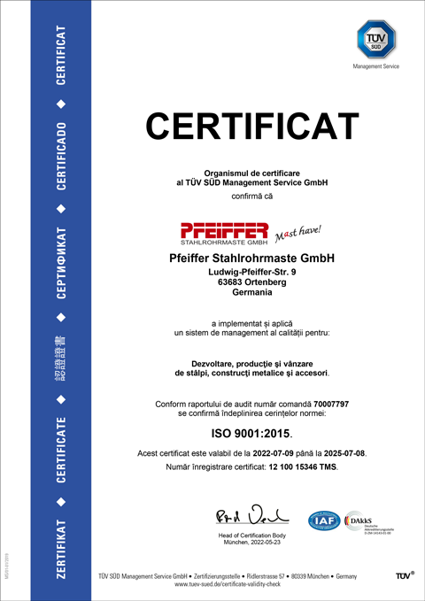 Suntem certificati si ne desfasuram activitatea conform ISO 9001:2000 si EN40, dispunem de certificatul DIN 18800 Klasse si certificatul de conformitate EG-Konformitätszertifikat în Germania de la Pfeiffer Stahlrohrmaste GmbH.